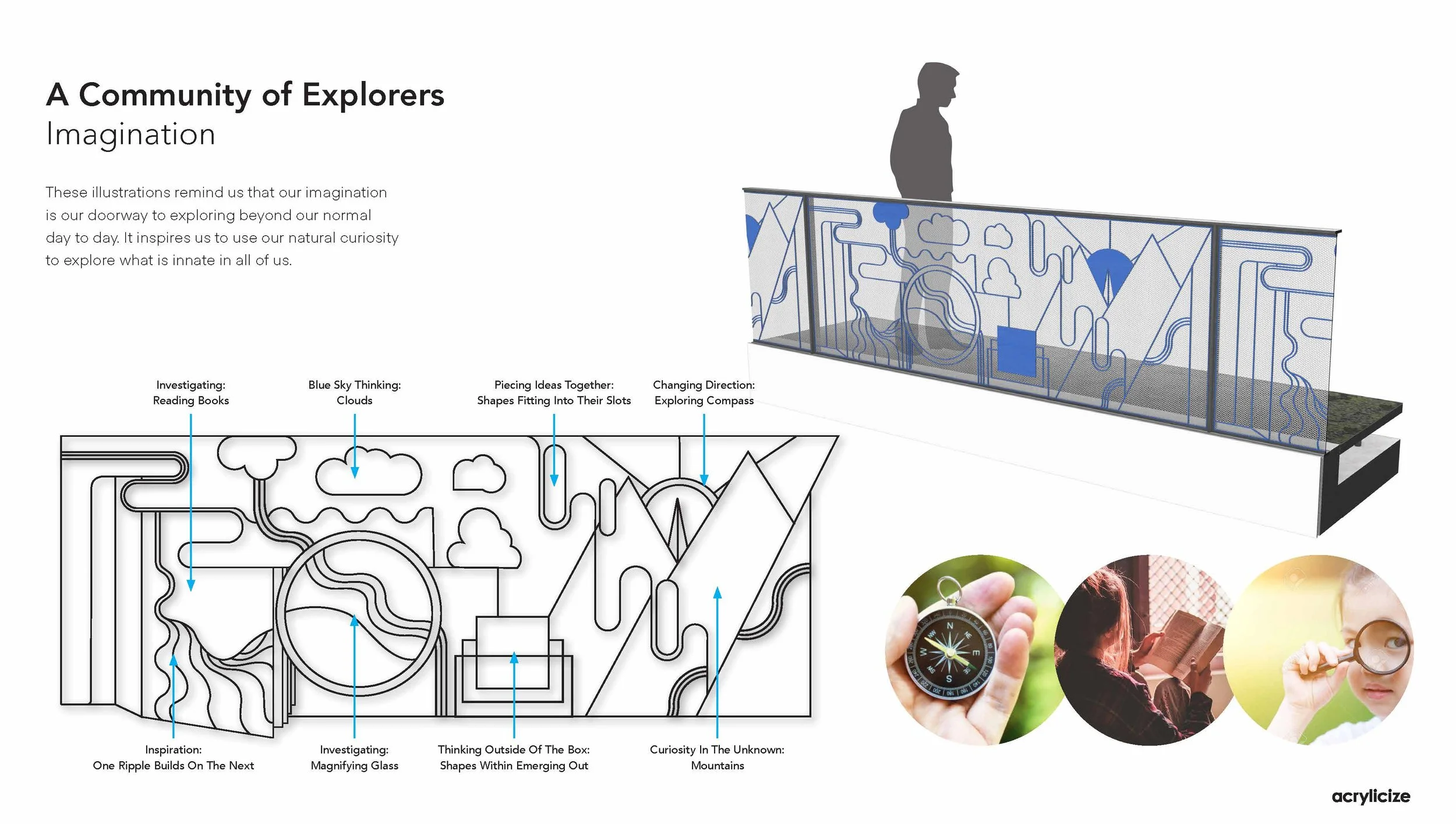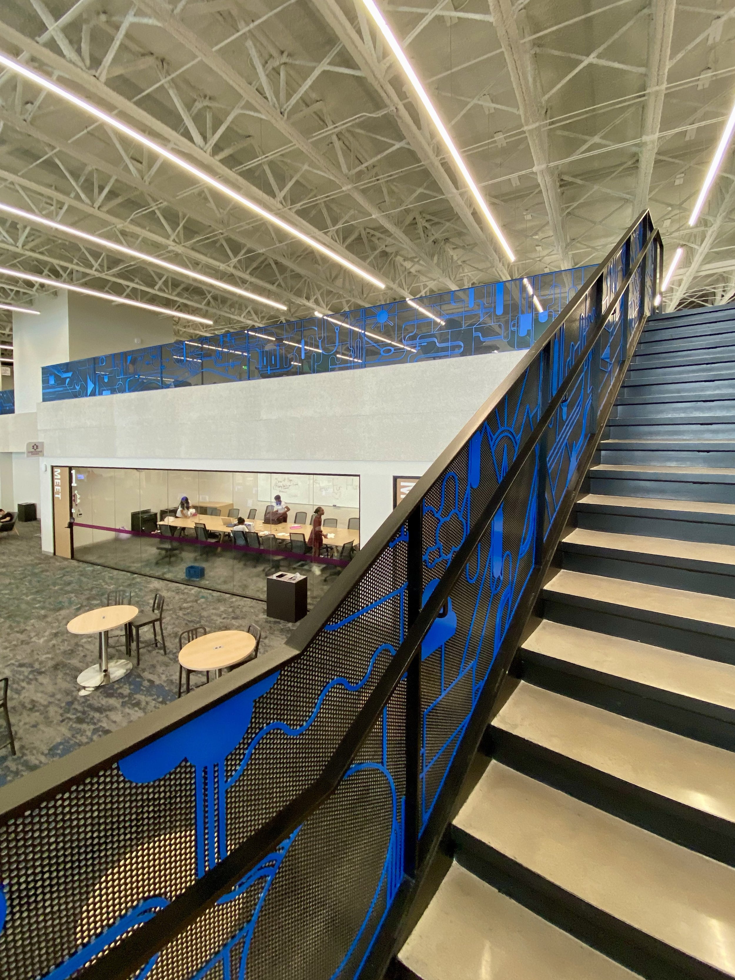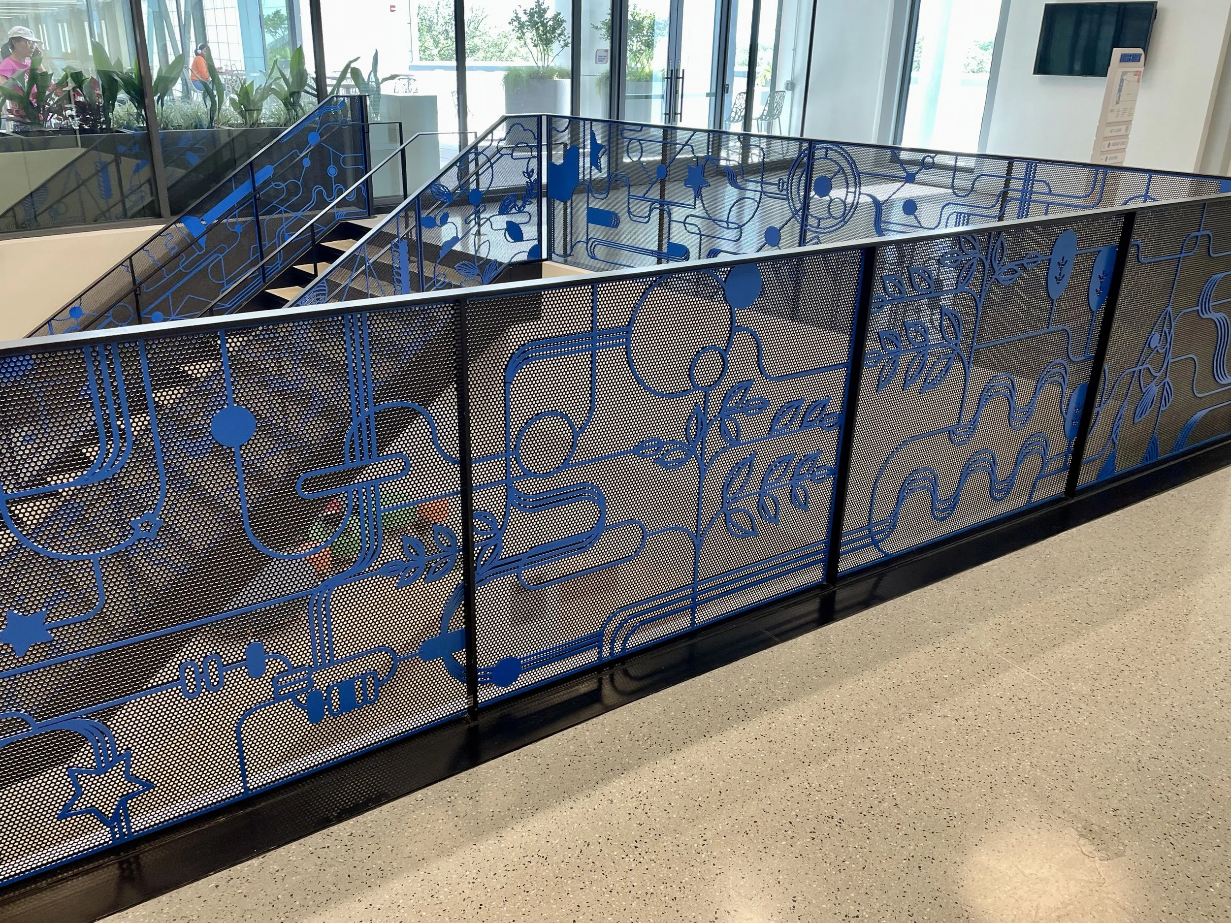 The artwork was designed to be explored from multiple vantage points. Visible on both sides of the perforated guardrail panels, the composition maintains a consistent base linework structure to ensure clarity and legibility while preserving an open, airy quality. Varying scales of detail invite close inspection, while larger illustrative moments—each representing one of the five themes—anchor the narrative and remain impactful from afar, allowing the story of exploration to be appreciated throughout the library.