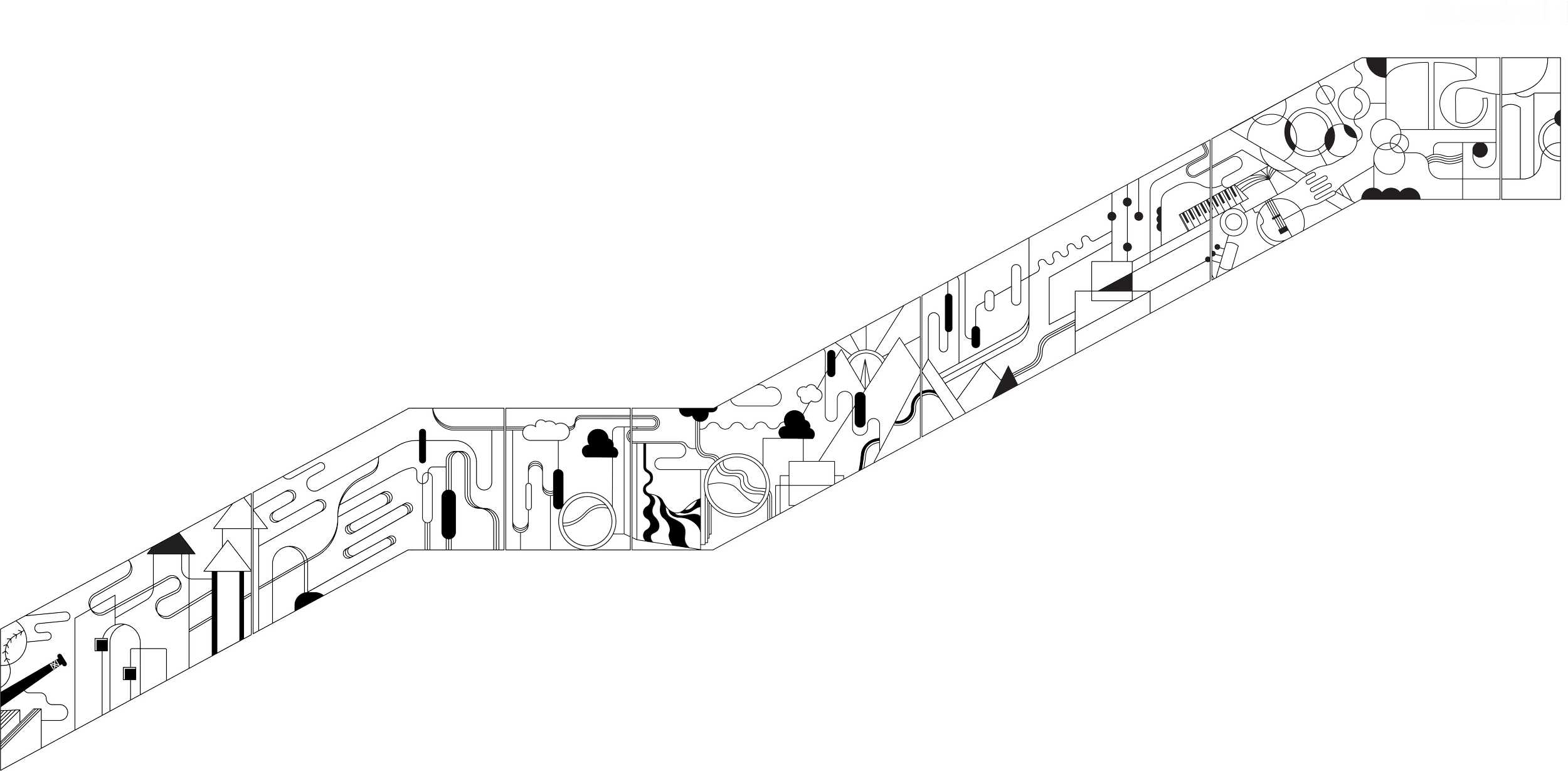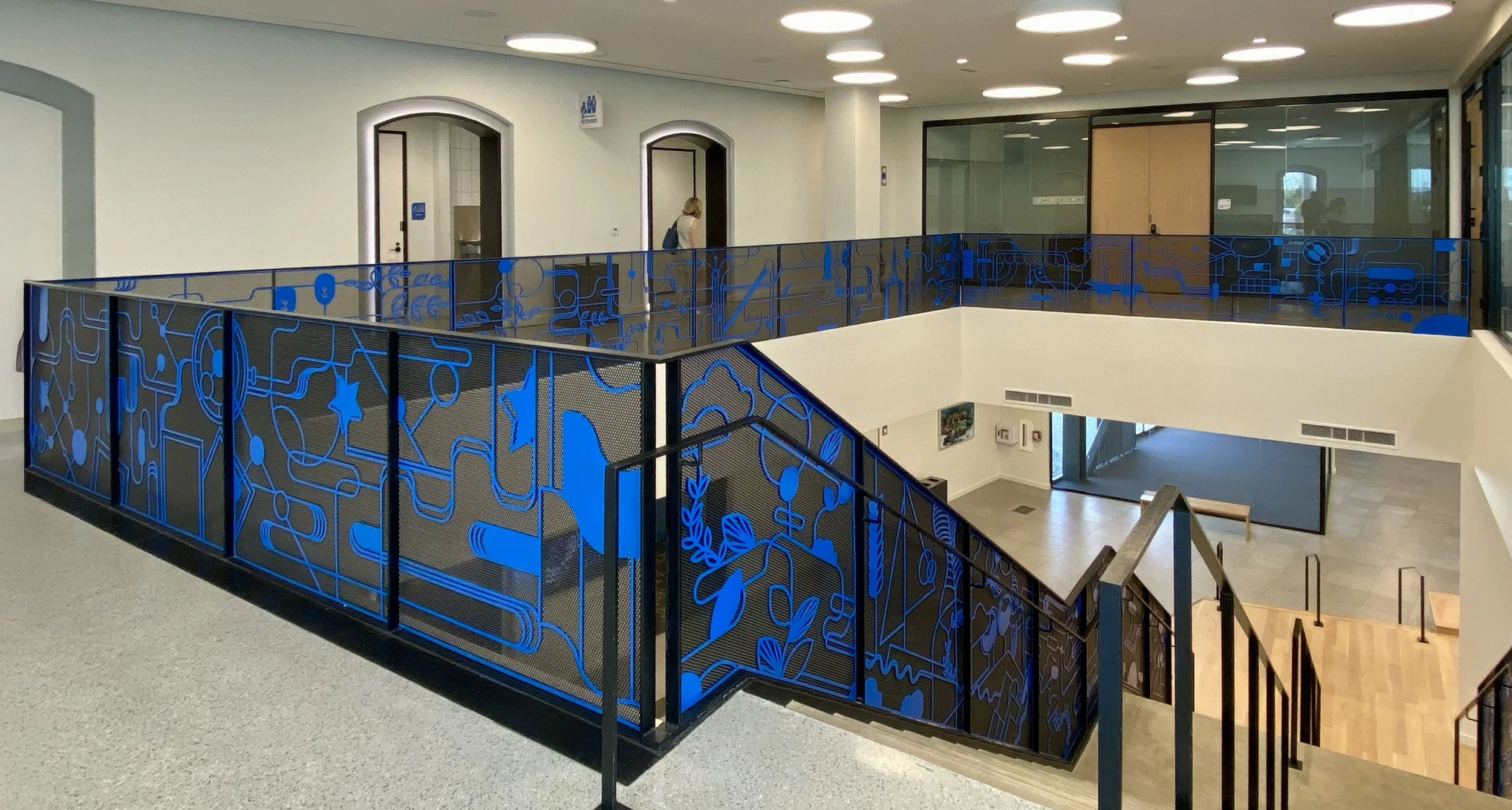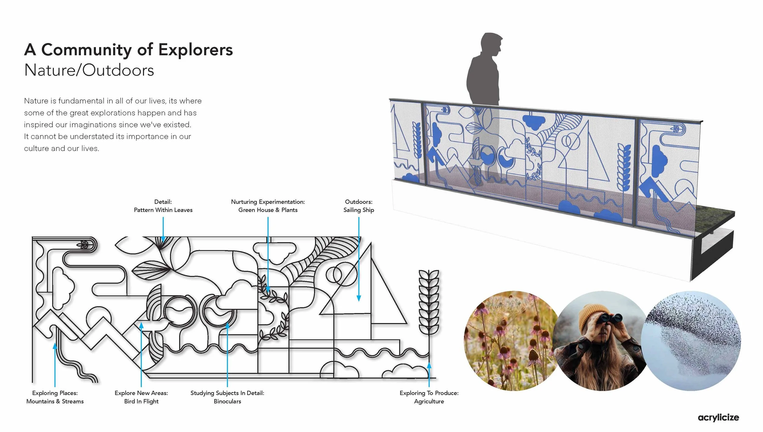 The artwork was designed to be explored from multiple vantage points. Visible on both sides of the perforated guardrail panels, the composition maintains a consistent base linework structure to ensure clarity and legibility while preserving an open, airy quality. Varying scales of detail invite close inspection, while larger illustrative moments—each representing one of the five themes—anchor the narrative and remain impactful from afar, allowing the story of exploration to be appreciated throughout the library.