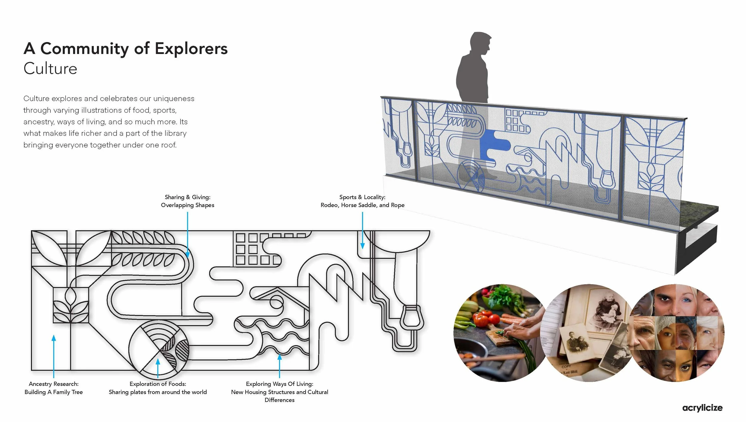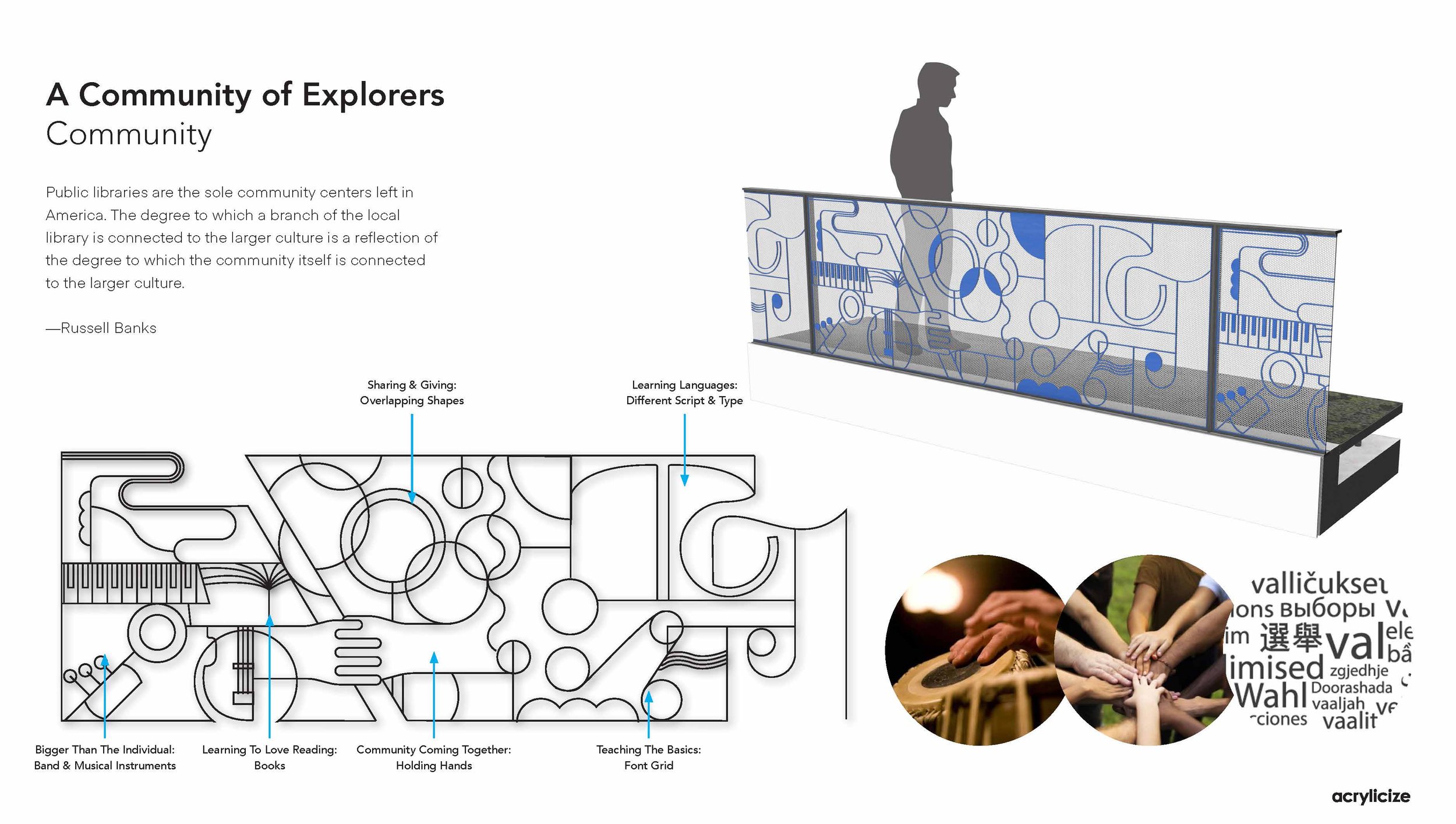 The selected concept, “Community of Explorers”, positions the library as an active site of curiosity and discovery. Anchored in the themes of Culture, Creativity, Nature, Community, and Imagination, the installation invites engagement at every scale.