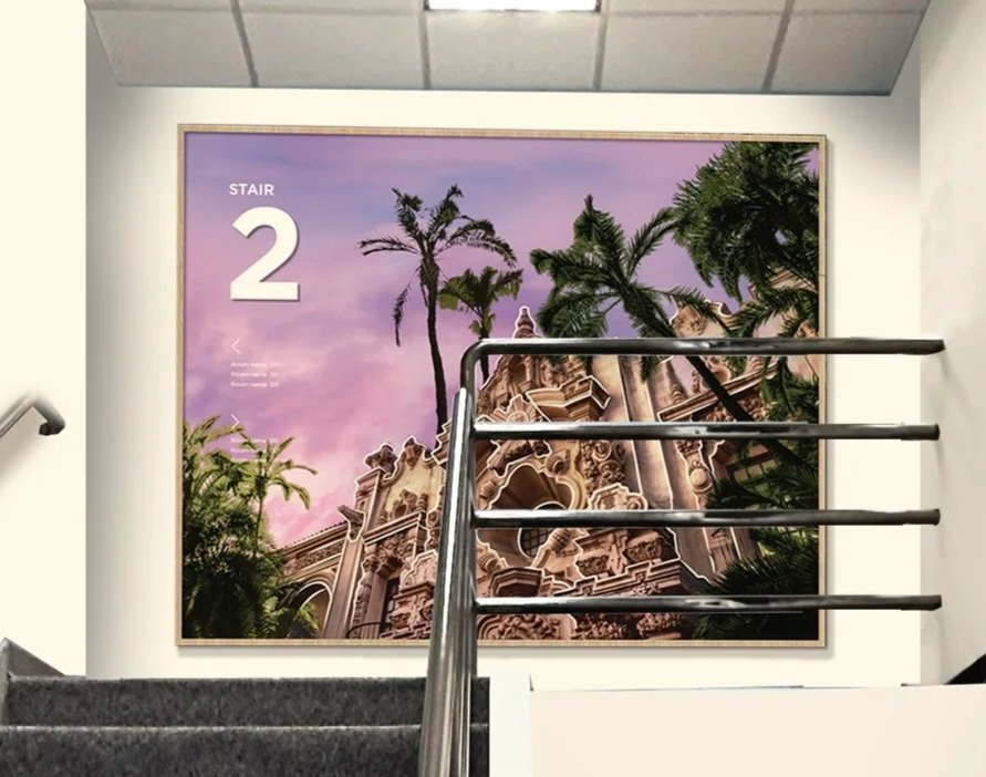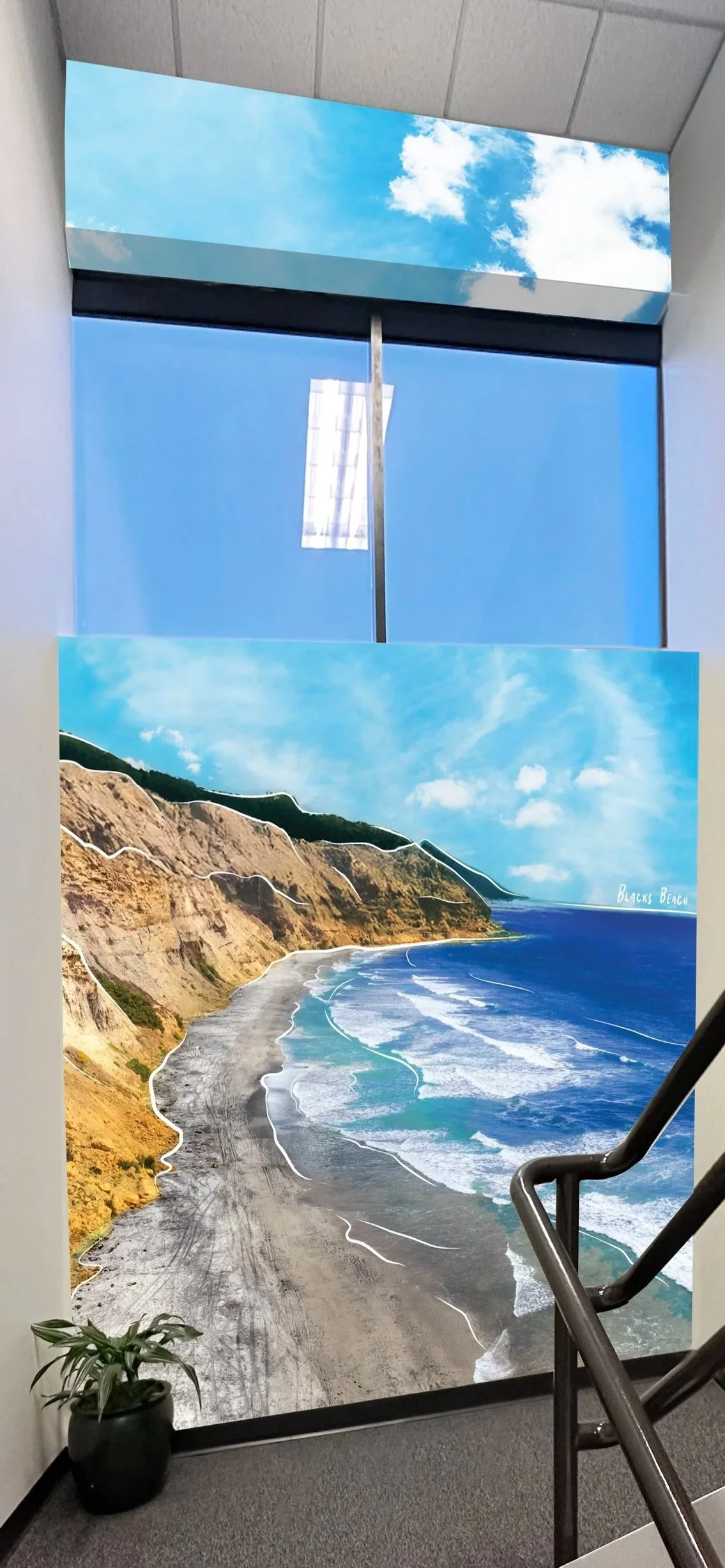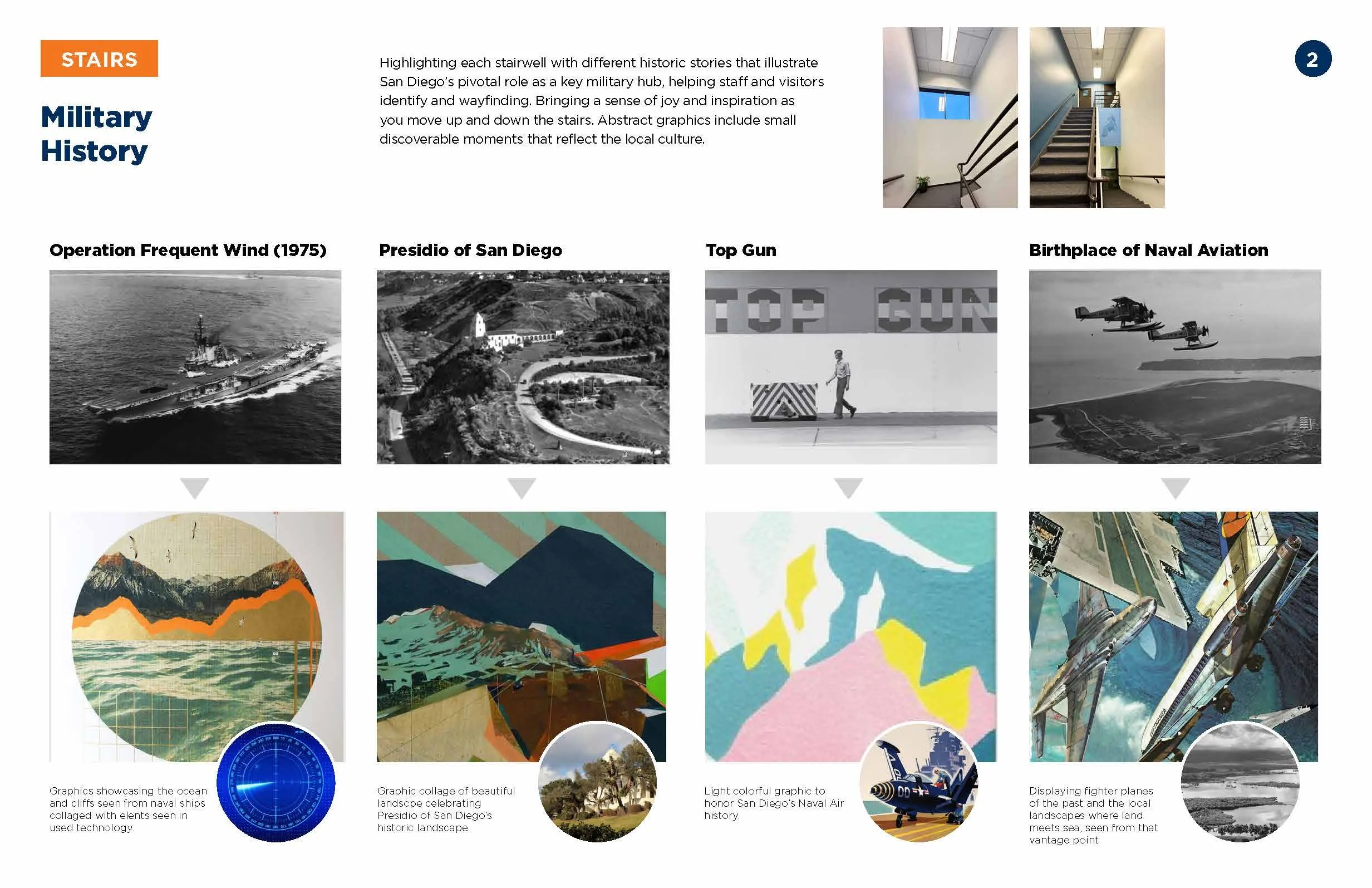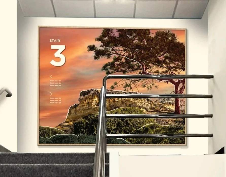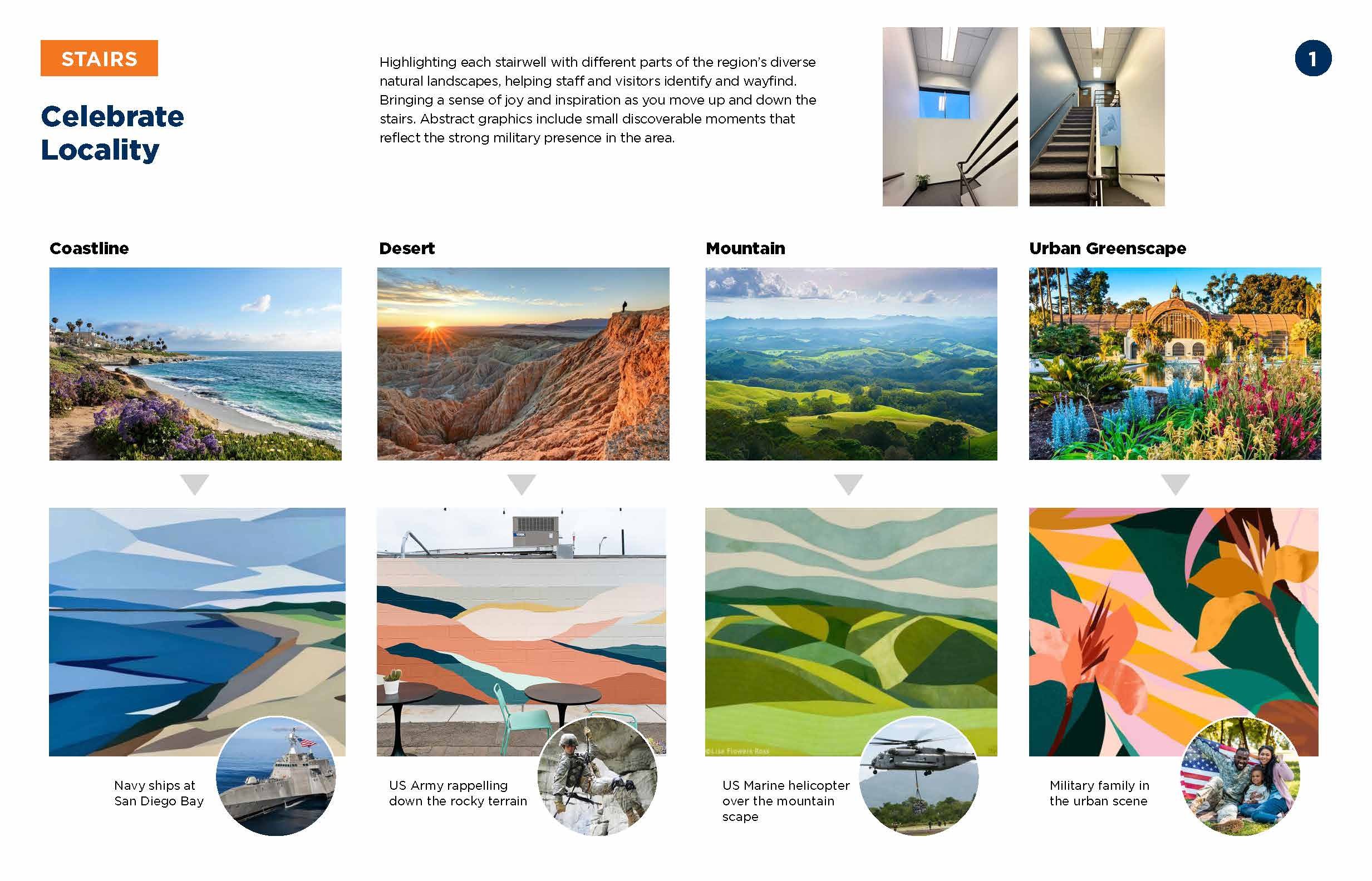 Four distinct stair locations, each drawing inspiration from the varied landscapes of San Diego. Graphics are intentionally placed at the mid-landing to suit the smaller scale of the space.