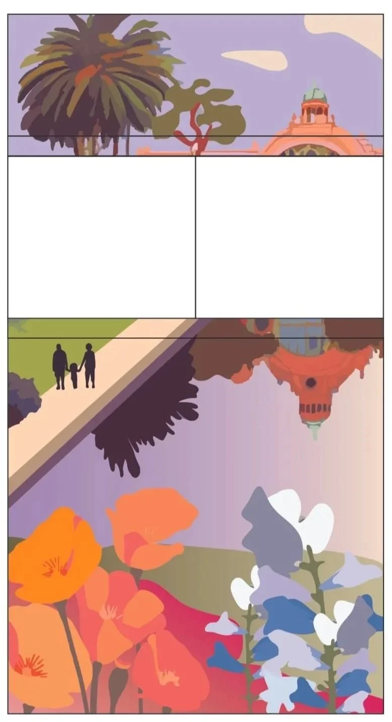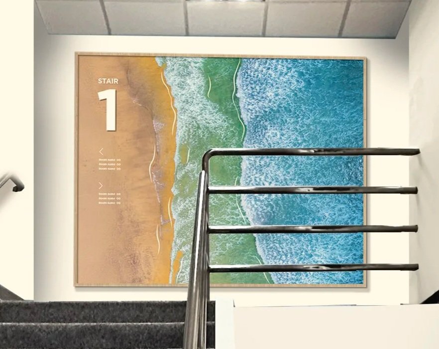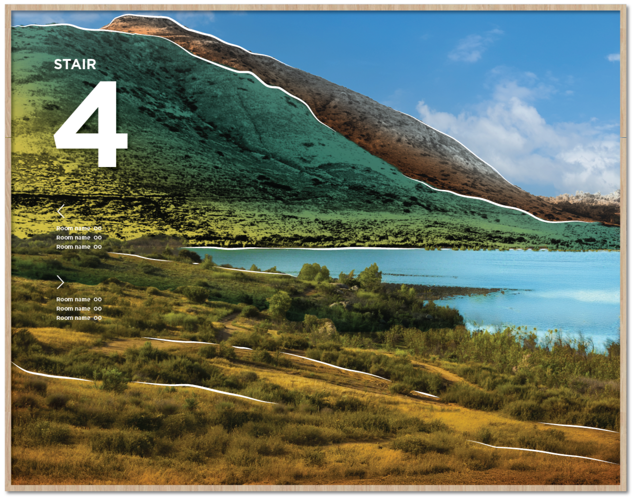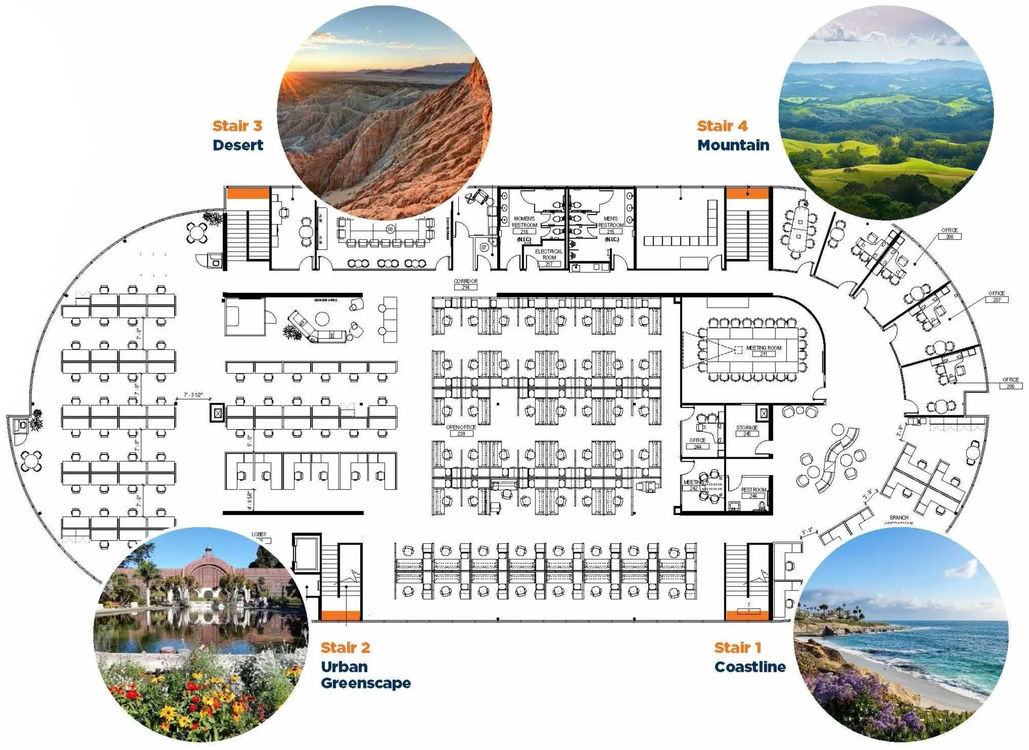 Four distinct stair locations, each drawing inspiration from the varied landscapes of San Diego. Graphics are intentionally placed at the mid-landing to suit the smaller scale of the space.