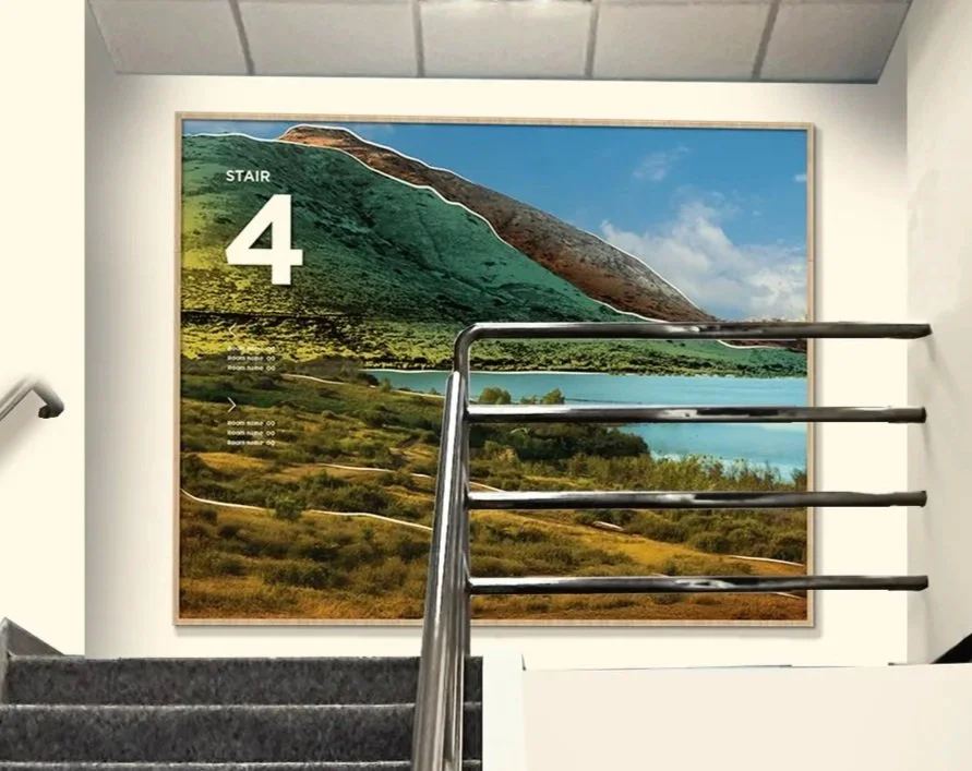 Mid-landing graphics were extended into framed Level 2 elements with integrated dimensional numbers and wayfinding. Stair 2 Graphic was developed in collaboration with Wes Ching. Art Direction by Nat Lowe.