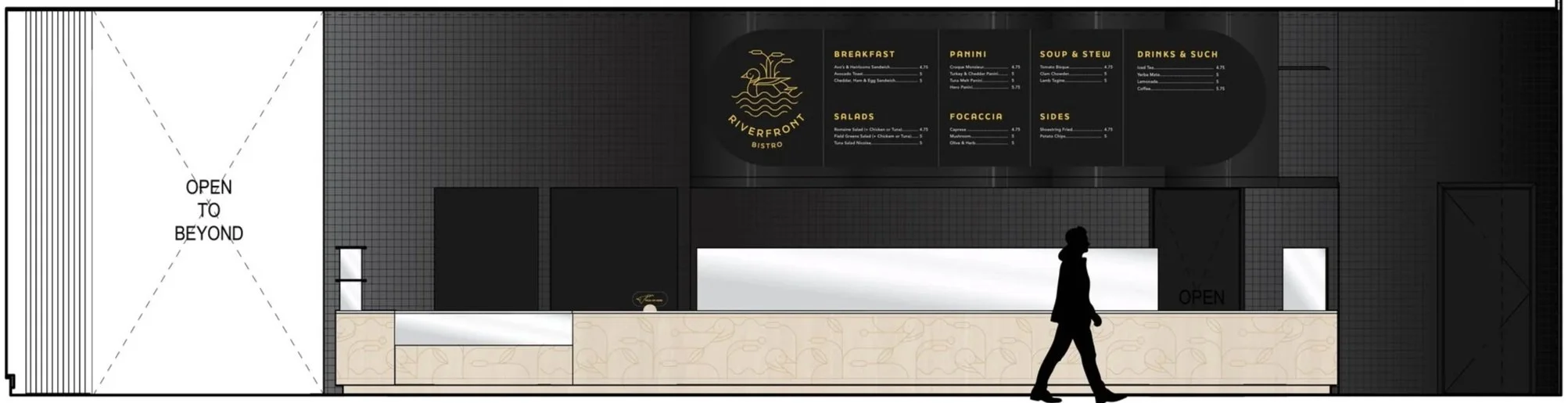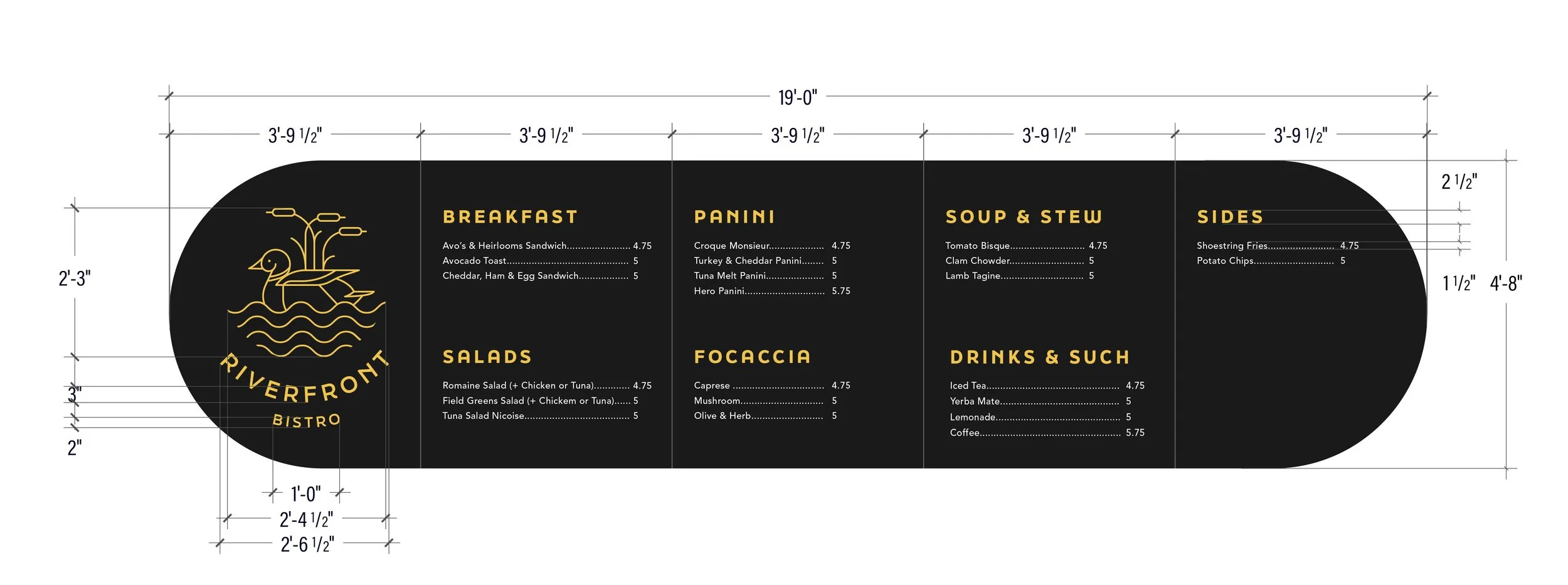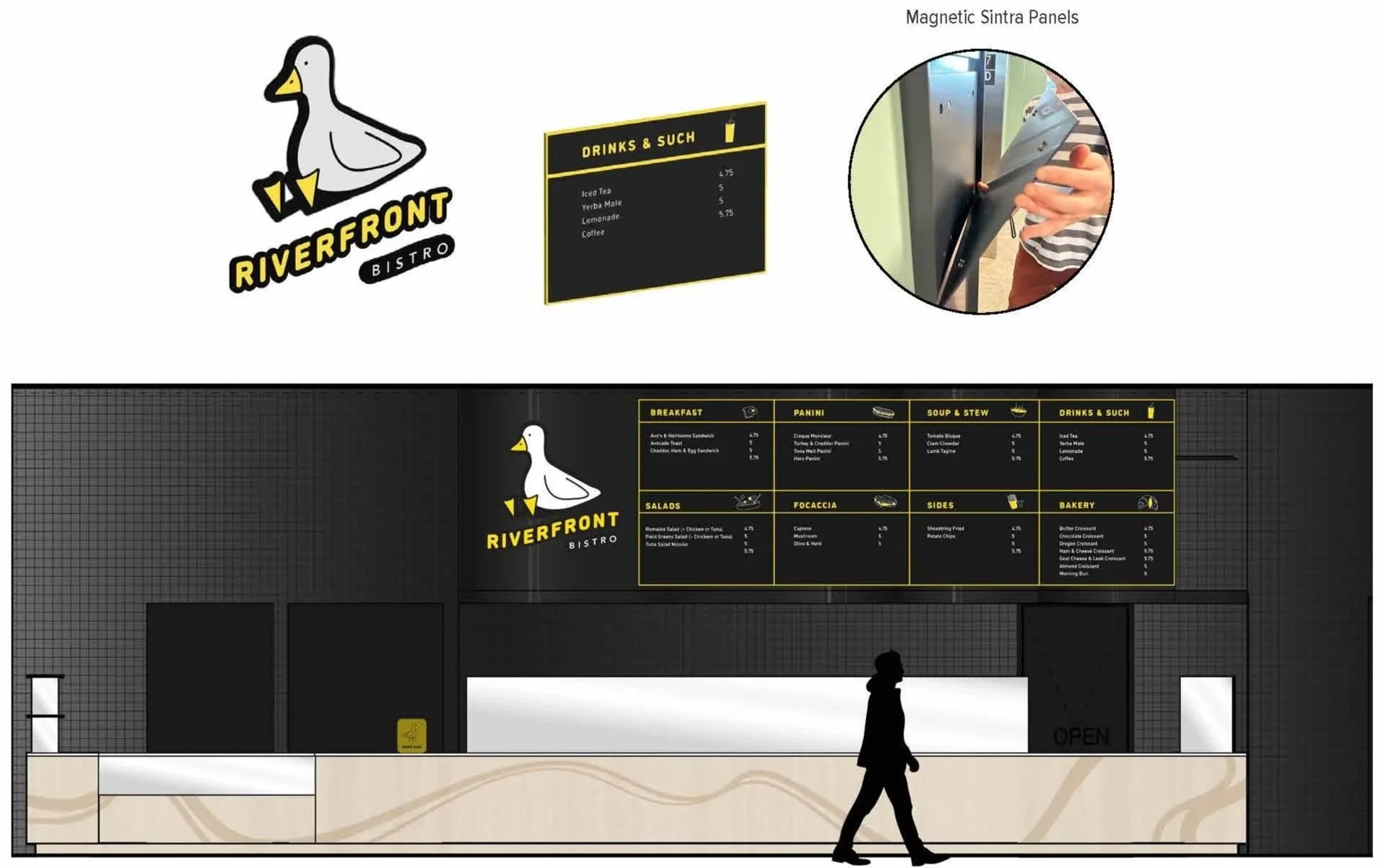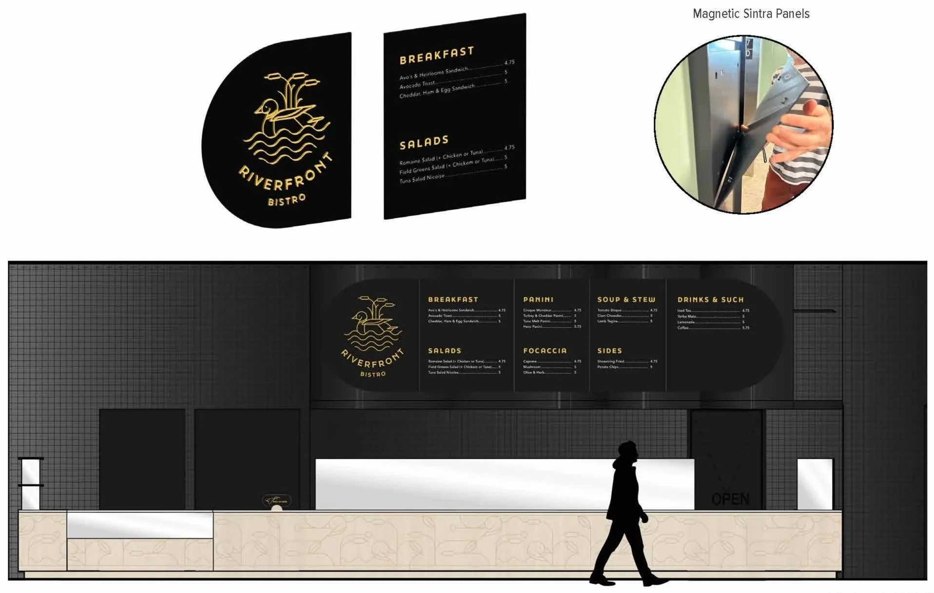Brief: The University of Oregon’s Knight Building 2 includes a first-floor bistro that required a cohesive brand identity and corresponding menu design. The client selected the name “Riverfront,” which served as the foundation for the visual direction developed by the design team. The primary identification sign was designed for installation on a black tile wall. The menu board needed to reflect the established branding while remaining flexible for frequent updates, and was designed to magnetically attach to the existing Rimex-fabricated fume hood. The team also explored the opportunity to incorporate a graphic element on the face of the service counter to further extend the brand within the space.