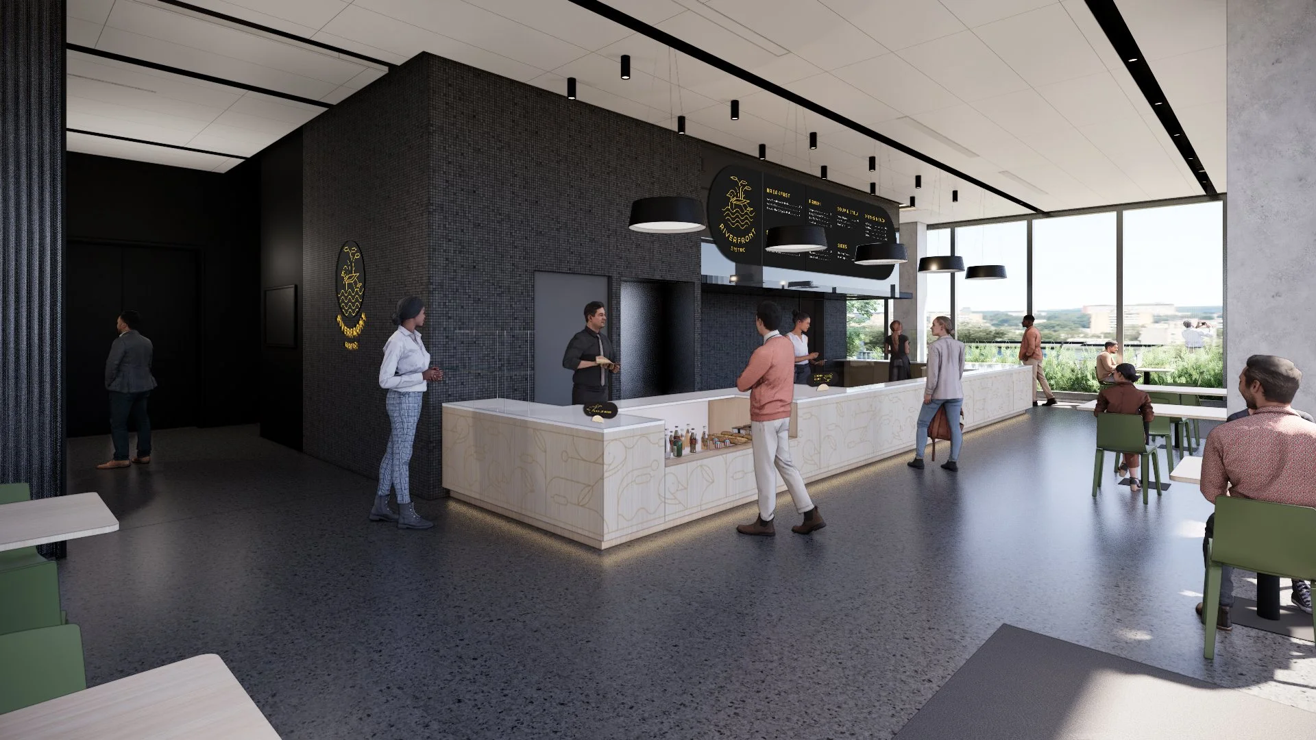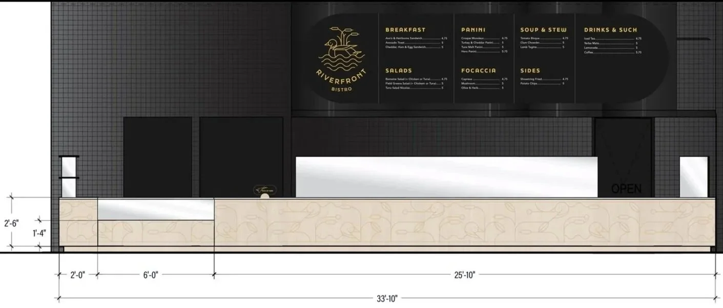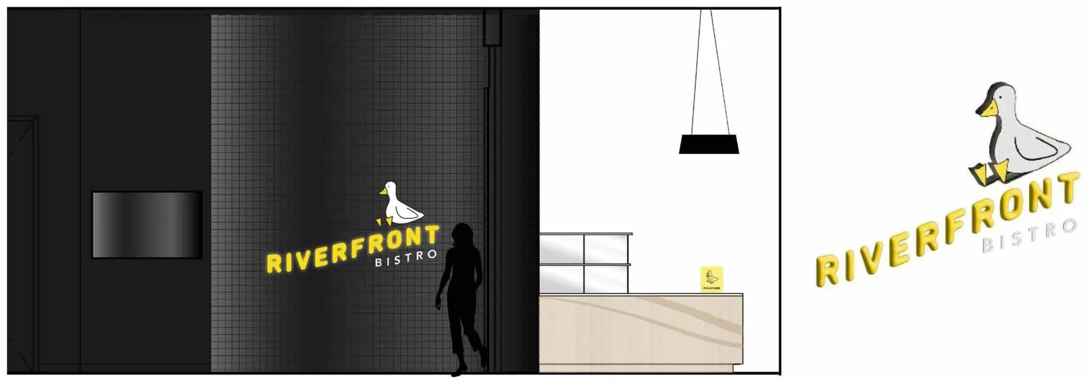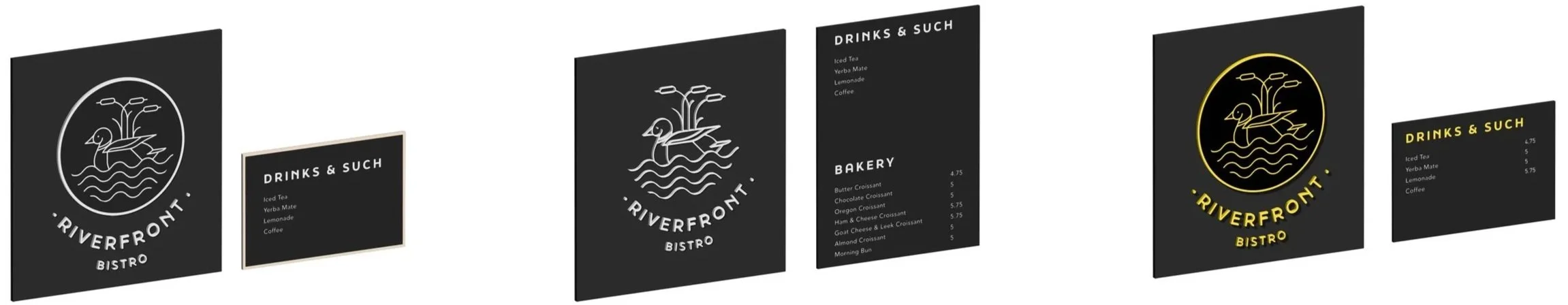 Brief: The University of Oregon’s Knight Building 2 includes a first-floor bistro that required a cohesive brand identity and corresponding menu design. The client selected the name “Riverfront,” which served as the foundation for the visual direction developed by the design team. The primary identification sign was designed for installation on a black tile wall. The menu board needed to reflect the established branding while remaining flexible for frequent updates, and was designed to magnetically attach to the existing Rimex-fabricated fume hood. The team also explored the opportunity to incorporate a graphic element on the face of the service counter to further extend the brand within the space.